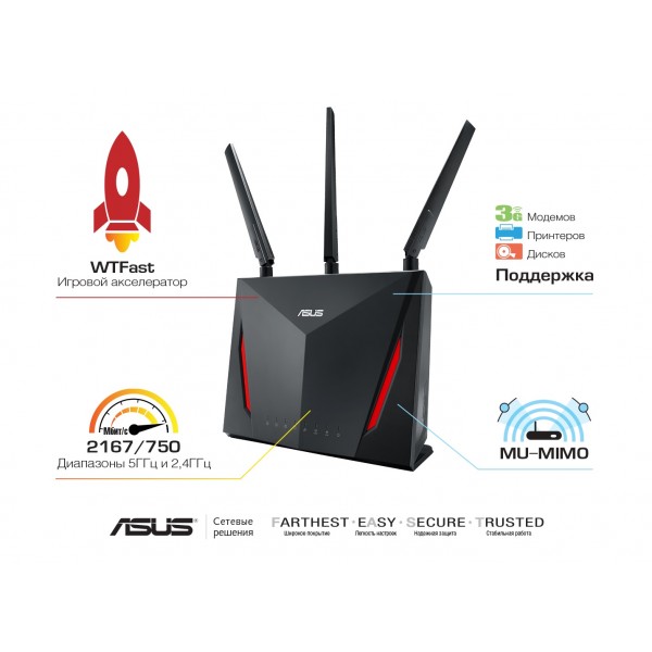 Маршрутизатор ASUS RT-AC86U – это новейшее геймерское решение, обладающее невероятно высокой скоростью (до 2917 Мбит/с по сети Wi-Fi) и наделенное дополнительными функциями, разработанными специально для любителей компьютерных игр. Поддержка AiMesh позволяет подключить RT-AC86U другому (другим) AiMesh-совместимым роутерам для создания единой сети Wi-Fi для всего дома с «бесшовным» роумингом.